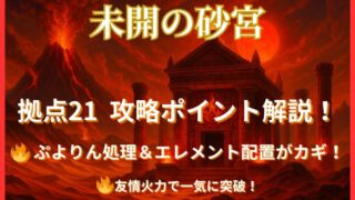 モンスト 【モンスト】未開の砂宮【拠点21】攻略|ぷよりん処理とエレメントエリア配置が勝利のカギ! 未開の砂宮 【拠点21】未開の砂宮【拠点21】は、感染ウイルスウィンドやエレメントエリアといった特殊ギミックに対応しながら戦うステージです。特にぷよりんの感染ウィルスウィンドは一瞬で全体壊滅に繋がるため、素早い処理が必須。さらに、直殴りでは... 2025.09.15 モンスト未開の砂宮