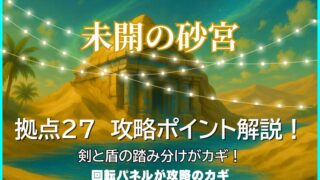 モンスト「未開の砂宮 拠点27」の攻略記事です。剣パネルと盾パネルの踏み分け、回転パネルの立ち回り、ボス戦のポイントを実際のプレイをもとに分かりやすく解説しています。攻略のコツや立ち回りを知りたい方はぜひ参考にしてください。