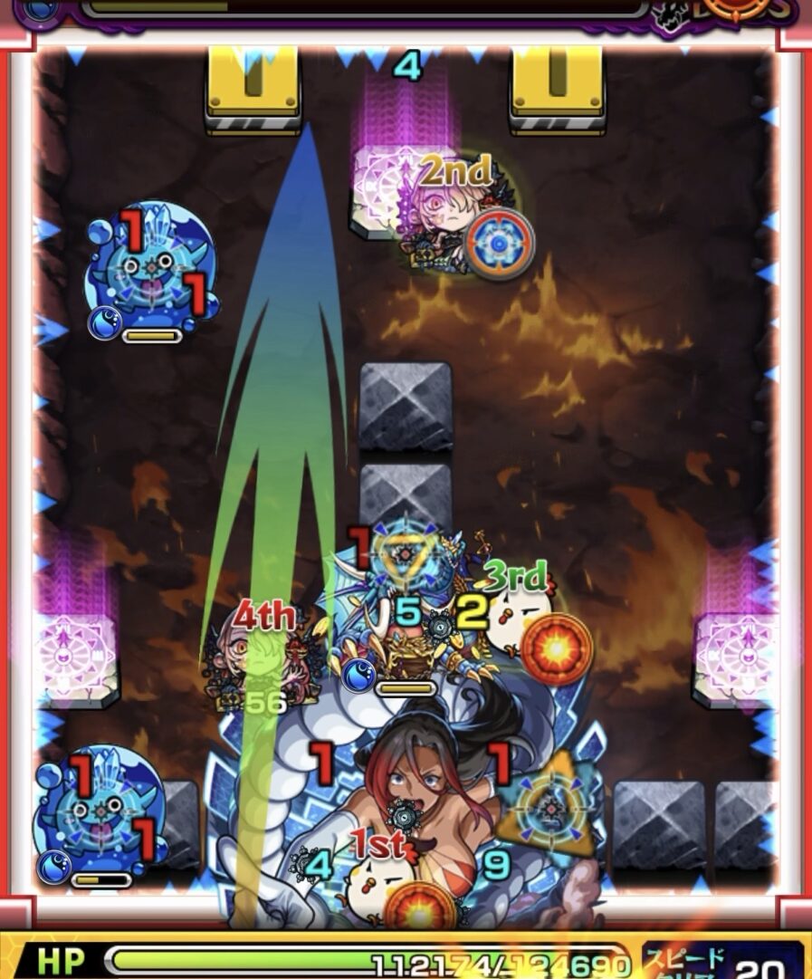 - 上壁から下壁へ反射し、上のエナジーコンテナを経由してエナジーを取得し、下のグロークランツの弱点を狙って攻撃しました。