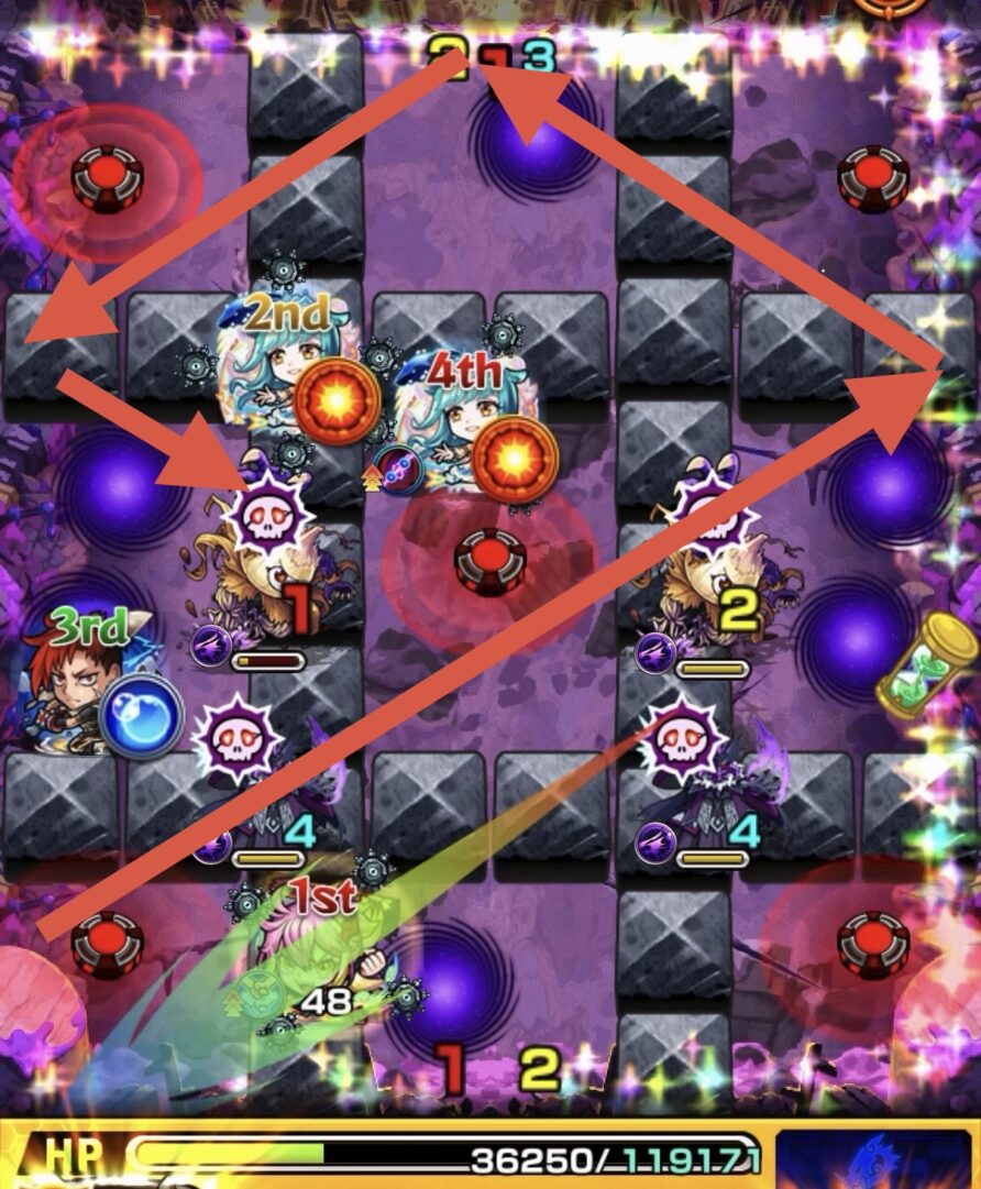 • ゲキリンは左角で反射しながら赤色のグローボムを踏んで攻撃力を上げ、魔導師とタマネギヘッドにふれつつ右壁、上壁、左壁と反射しながら、タマネギヘッドの同時処理を狙って攻撃しました。